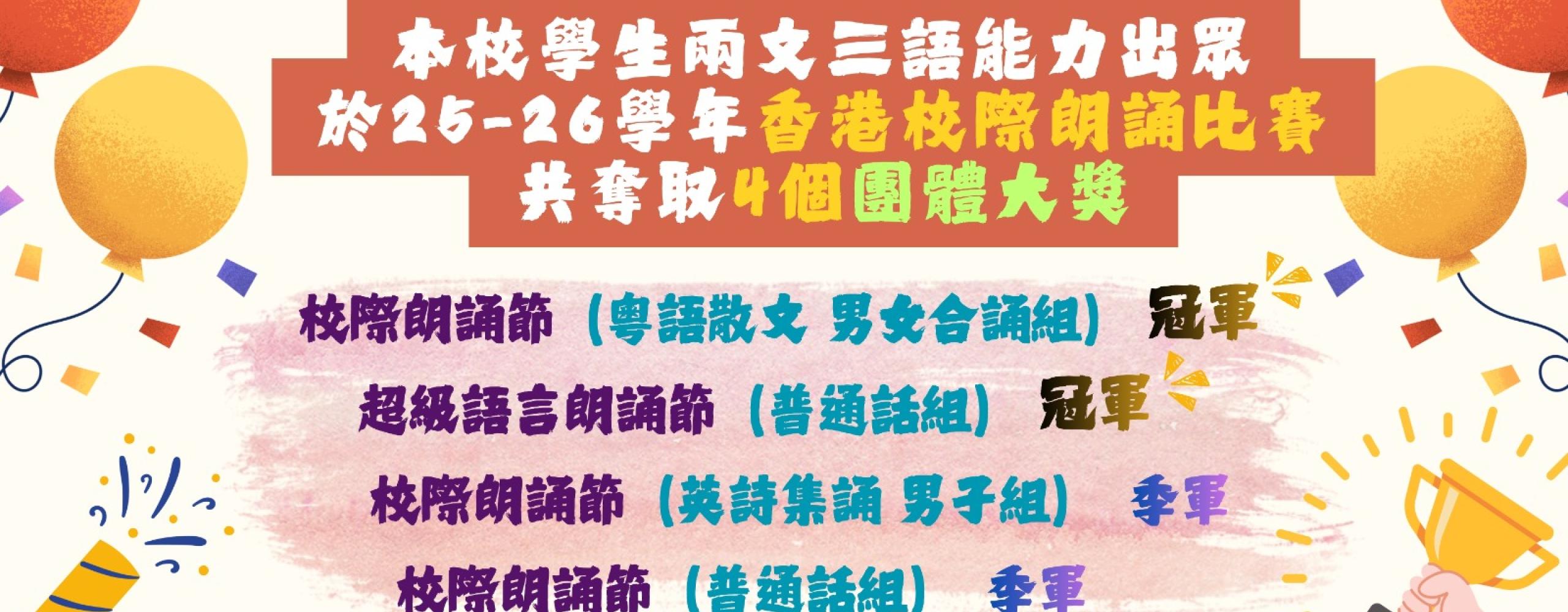 恭賀本校同學獲得「第五十五屆超級語言朗誦節」(普通話小學三、四年級詩詞合誦)冠軍