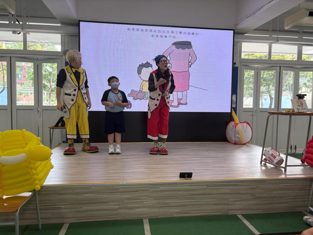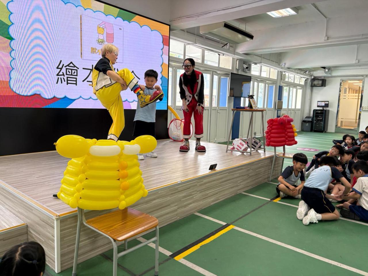 2026-04-28 早前,一、二年同學於閱讀課觀賞了一場與繪本《脫不下來啊》的表演。小丑演教員用氣球做出七彩繽紛的道具加上故事的形式帶領同學們看看繪本中的主角因為脫不下衣服引發一連串爆笑事情,實則充滿了天馬行空的想像力。對孩子來說,這件事情不僅貼近他們的生活經驗,還說出了他們曾有過的想法呢! 閱讀推廣